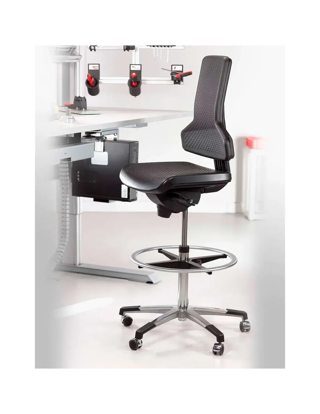 Страна: Германия. Класс: промышленное кресло, кресло для ESD зон, эргономичное. В кресле TEC PROFILE ESD производитель Dauphin предлагает эффективное сочетание дизайна, функциональности и безопасности на рабочем месте. ESD кресла - электростатические кресла с защитой от электростатического разряда для использования в электрощитовых и зонах повышенной чувствительности. Обивка, ламинируемая металлическими волокнами, обеспечивает рассеивание электростатических зарядов, создавая безопасную среду для оборудования и работника. Основа: полированный алюминий. Механизм: синхронный. Регулировки: высота кресла, высота спинки, фиксация наклона, глубина сиденья. Подлокотники - опция. Сужающая спинка обеспечивает большую свободу движений и эффективную поддержку верхней частии тела. Оббивка: полиуретан, черный цвет. Максимальная нагрузка:120 кг. Гарантия: 5 лет.
