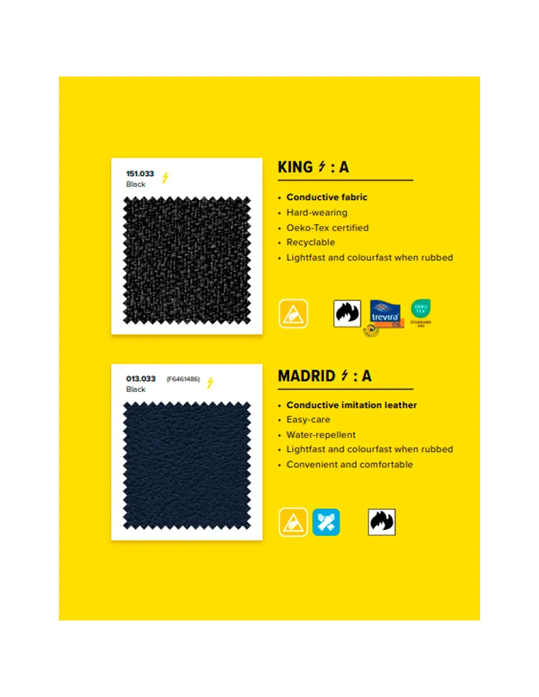 Кресла соответствуют требованиям по рассеиванию статического заряда, изложеным в DIN EN 61340-5-1:2001; протестировано LGA Nuremberg. Сопротивление Rg ≤ 1x106 Ω.