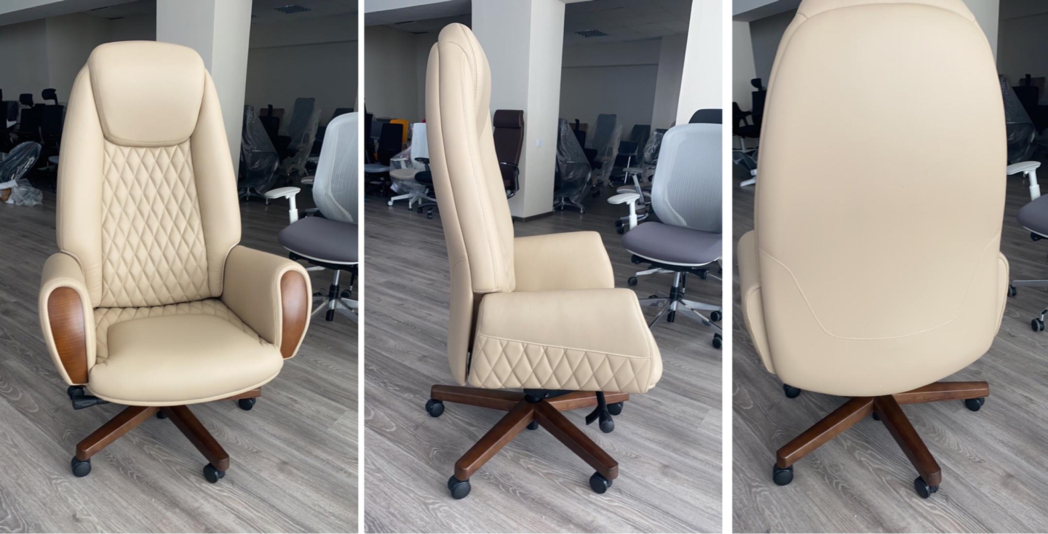 Кресло директора Боинг в светлой коже с акцентом из дерева - фото из выставочного зала кресел Kreslalux в Киеве