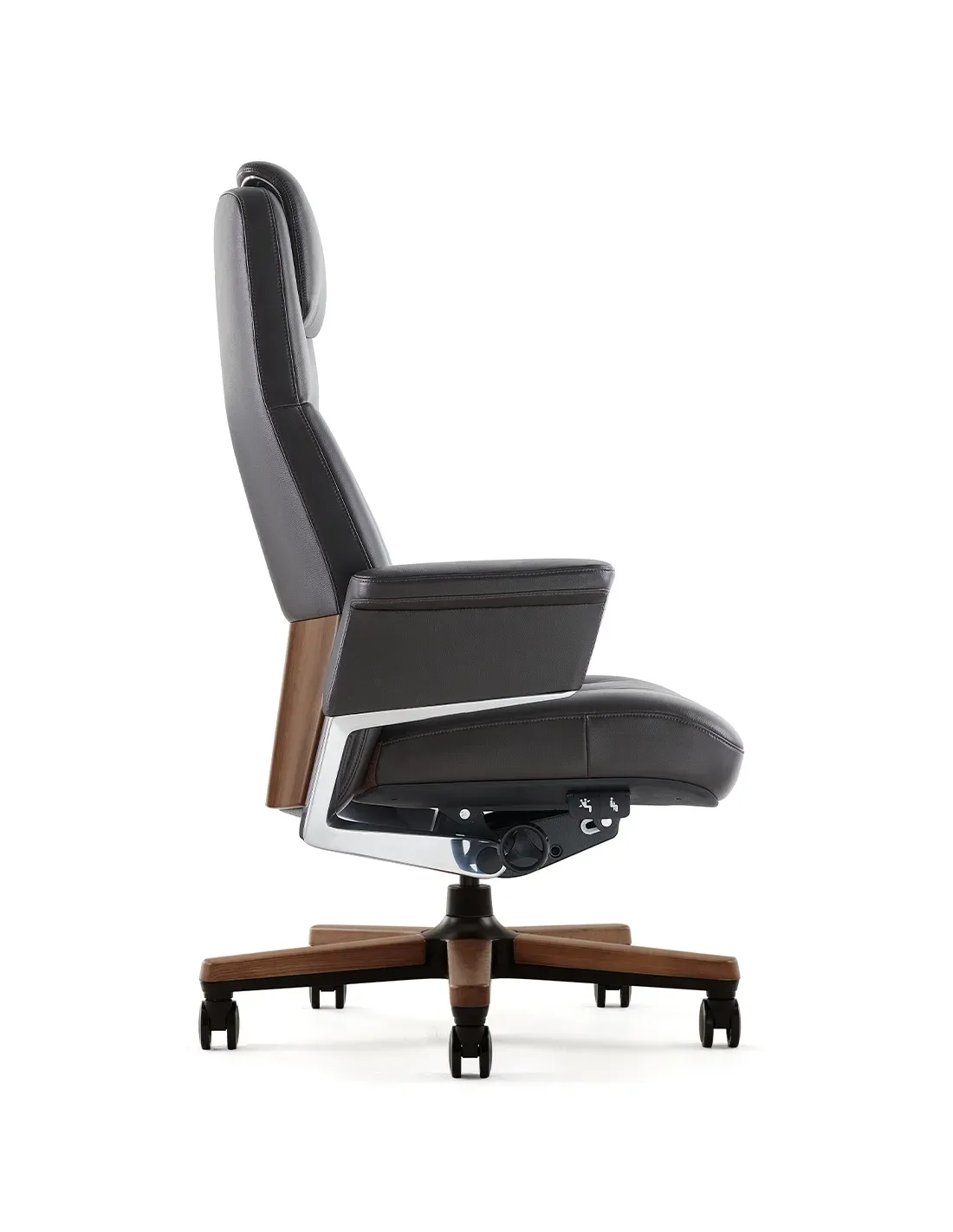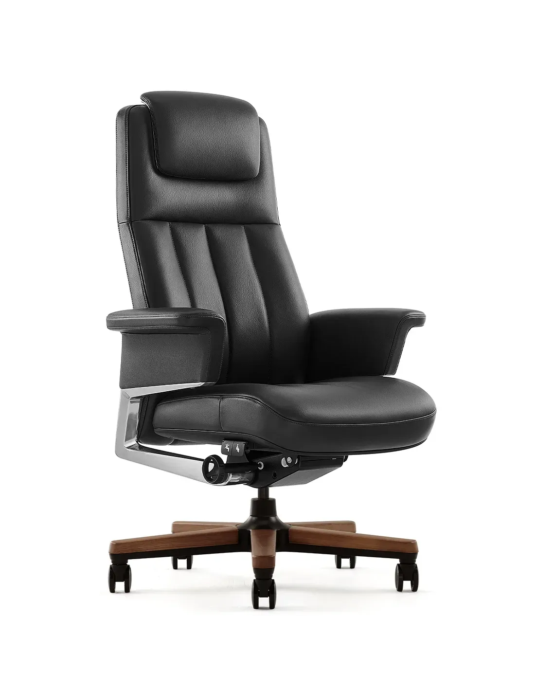 Країна: Китай. Клас: крісло керівника преміум-класу. Класично елегантне крісло з відтінком розкоші, що ідеально підходить для преміальних конференц-залів та кабінетів керівників. Воно випромінює відчуття високої якості та ідеально підходить для просування престижних проектів. Основа: метал, покритий деревом. Оббивка: натуральна шкіра, колір - чорний. Механізм: синхронний. Регулювання: висота посадки, фіксація спинки, жорсткість пружини качання, глибина сидіння. Підголівник: регульований по висоті. Підлокітники: нерегульовані. Максимальне навантаження: 120 кг. Гарантія: 3 роки.